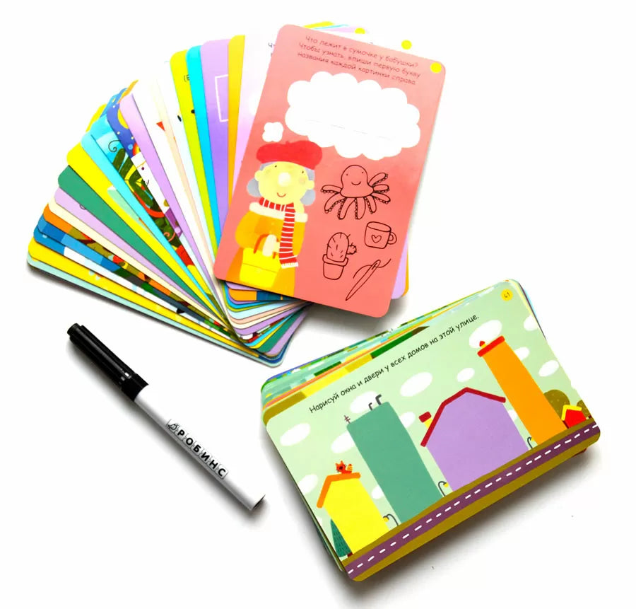 В набор входит 50 двусторонних многоразовых карточек с методически проработанными заданиями для тренировки мозга дошкольника
