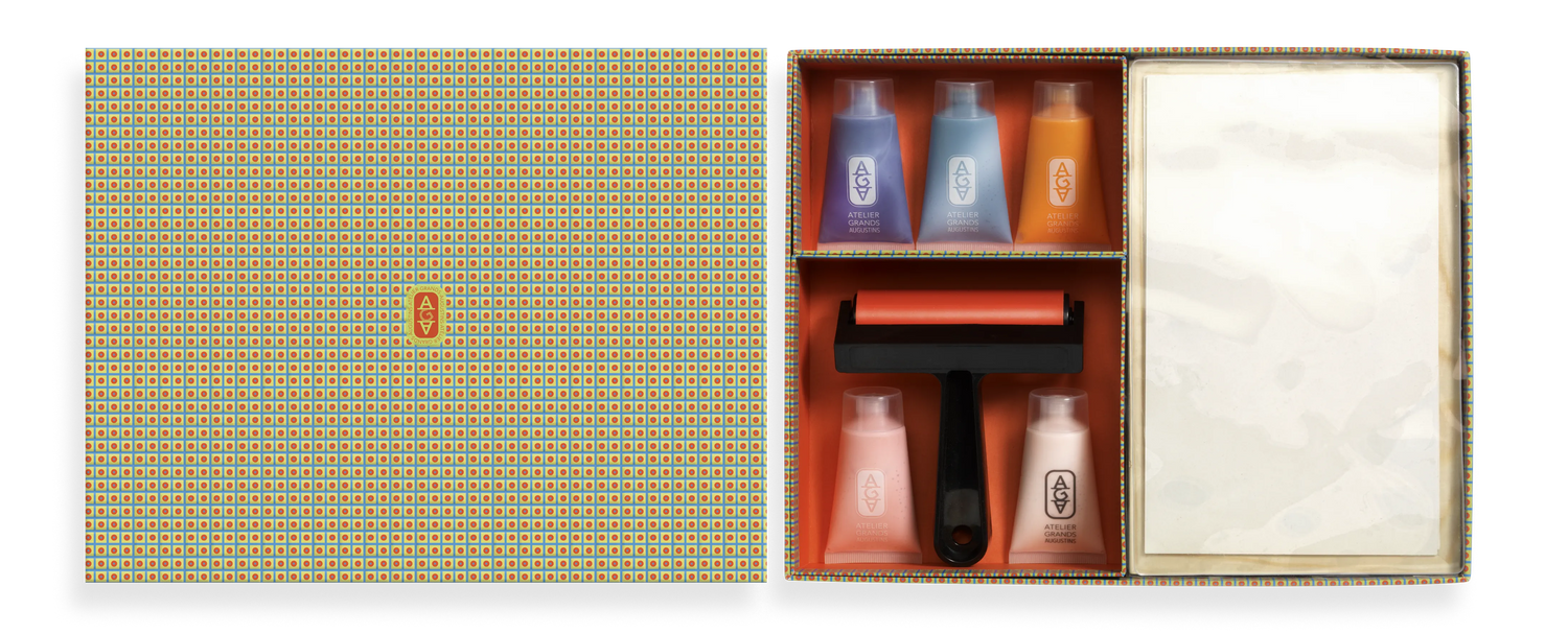 Discover the meditative art of gel printing with this Atelier 47 introduction kit. Using a reusable gel plate, overlays, plant imprints, and stencils, you'll create unique, layered prints by experimenting with texture, colour, and shape. Each design becomes a genuine work of art. A guided video tutorial walks you through proper techniques at your own pace, making this an ideal calm, creative activity to enjoy at home. Perfect for those seeking a relaxing artistic escape.