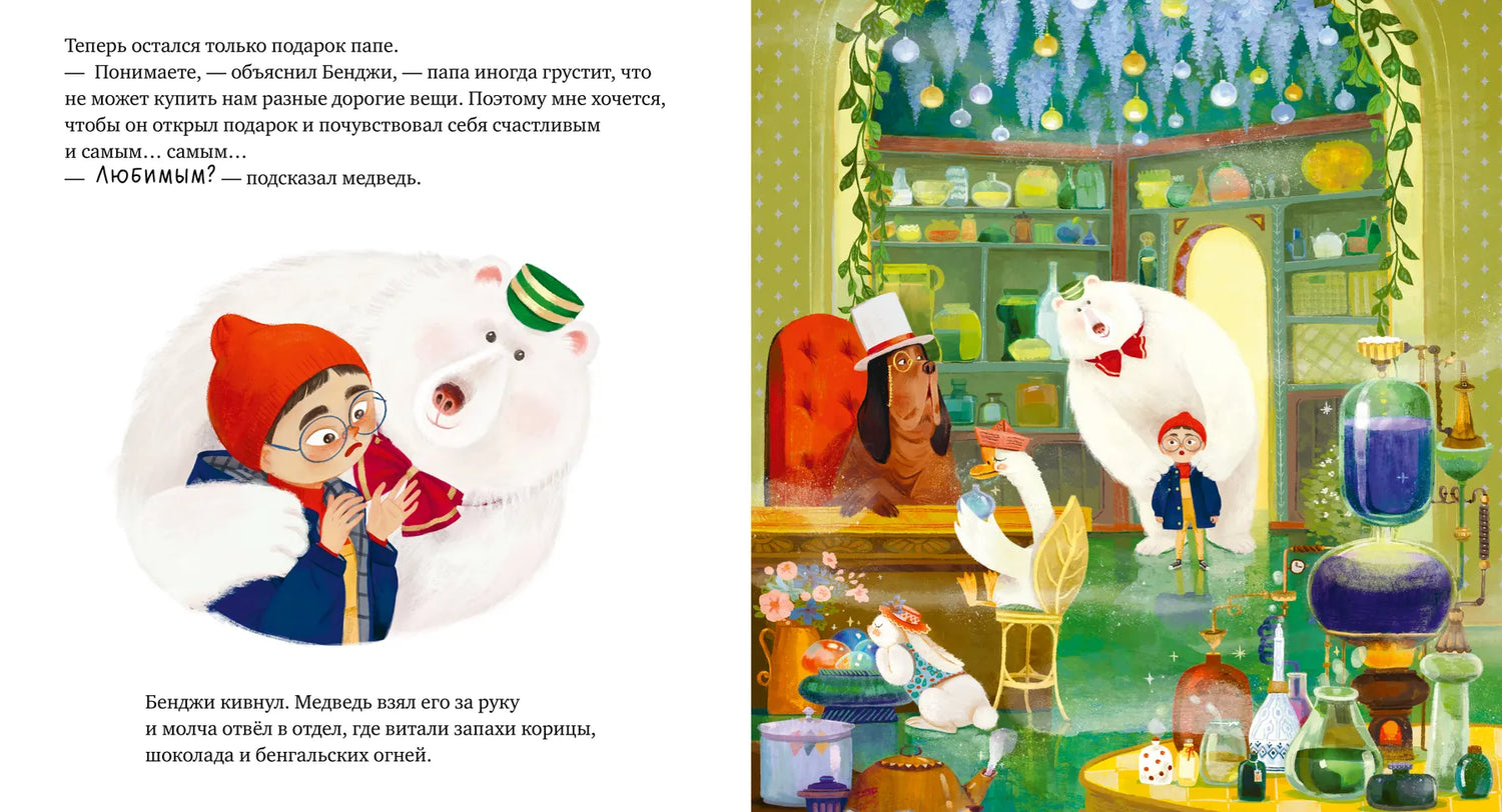 В этот новогодний праздник в семье Бенджи не ждали ни наряженной ёлки, ни праздничного угощения. Но не зря говорят, что под Новый год происходят настоящие чудеса. Бредя по шумным улицам родного города, Бенджи замечает великолепный магазин подарков, где… хозяйничает белый медведь, а за необычные подарки можно заплатить звонкой песней. Волшебство может прийти в каждый дом — нужно только верить в это! Тёплая история о доброте и любви к близким.