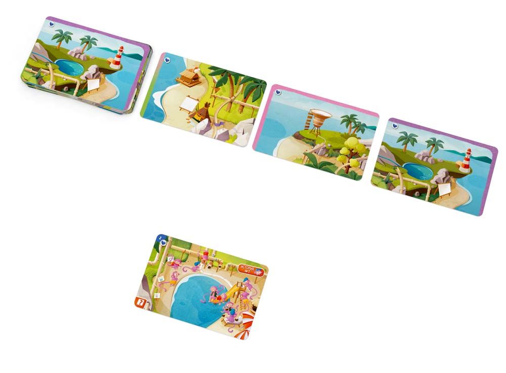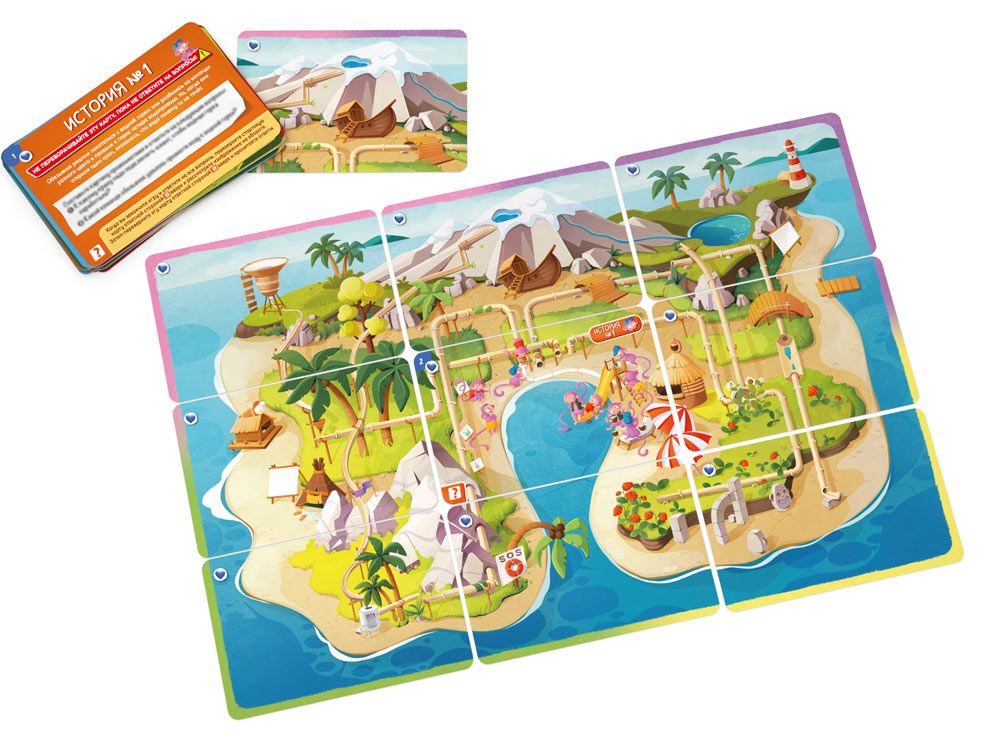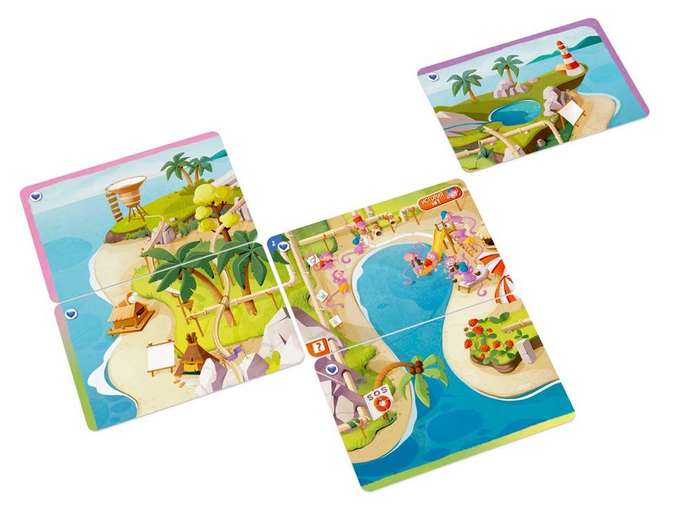 «Переполох на острове» — это кооперативный детектив-пазл для самых маленьких. Игрокам предстоит восстанавливать события, собирая общую картину из карточек. В отличие от взрослой серии, здесь нет текста на игровых картах, что делает игру доступной даже тем, кто еще не умеет читать.