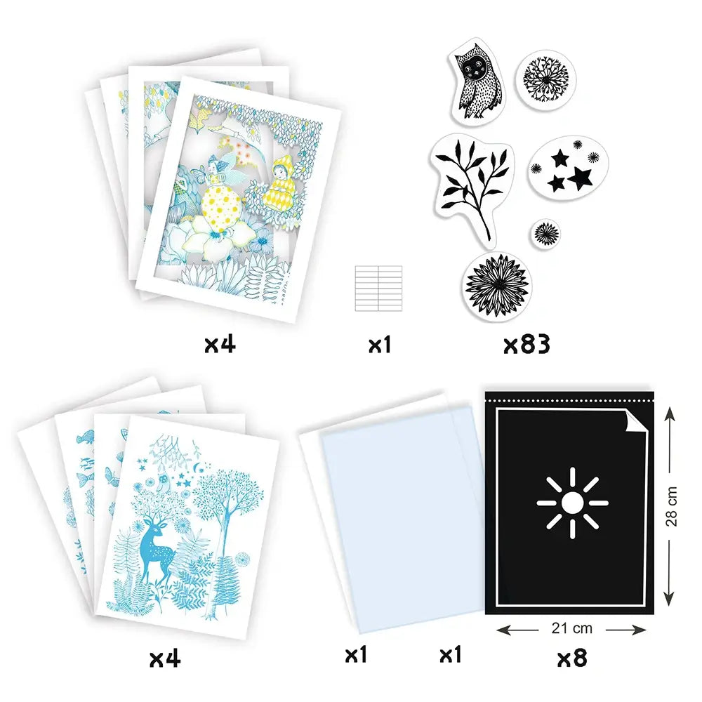 Discover the magic of light and color with Djeco's Au clair de la lune kit. Inspired by the beauty of the night, this kit allows you to create unique, dreamy images using the cyanotype process. Simply place the shapes on the photosensitive paper and let the sunlight do the rest. A relaxing, chemical-free activity perfect for all ages.
