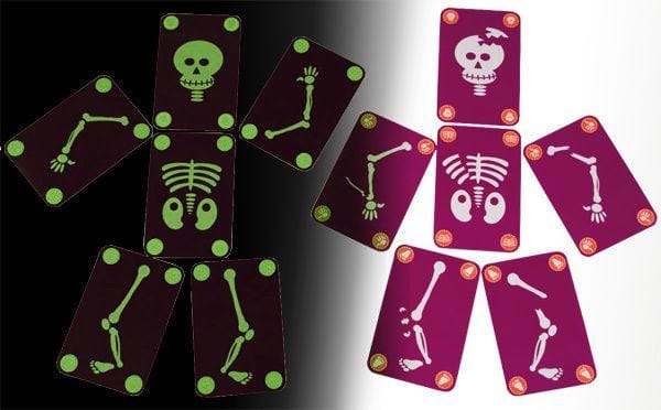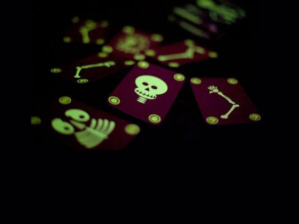 A glow in the dark strategy game. Find 6 parts of a skeleton, but be careful of broken bones! An exchange game with phosphorescent cards so you can also play in the dark.