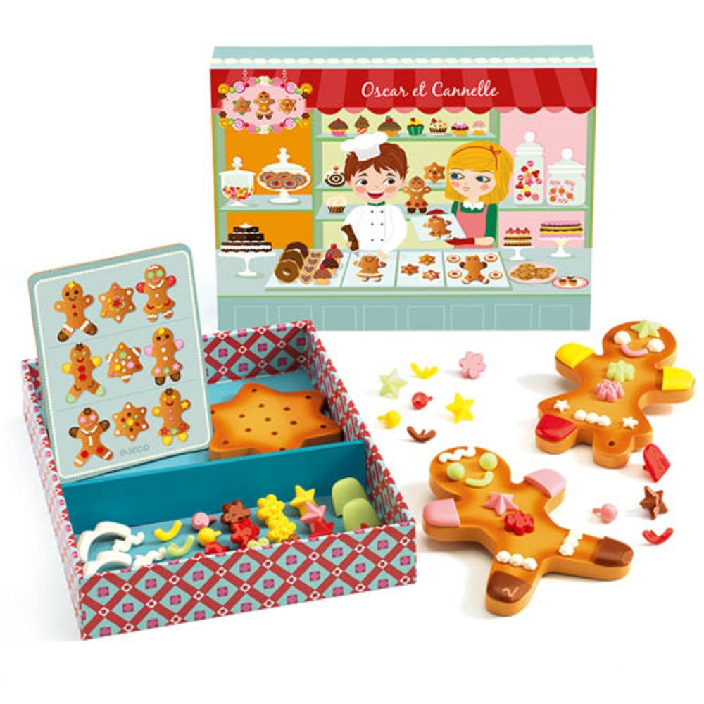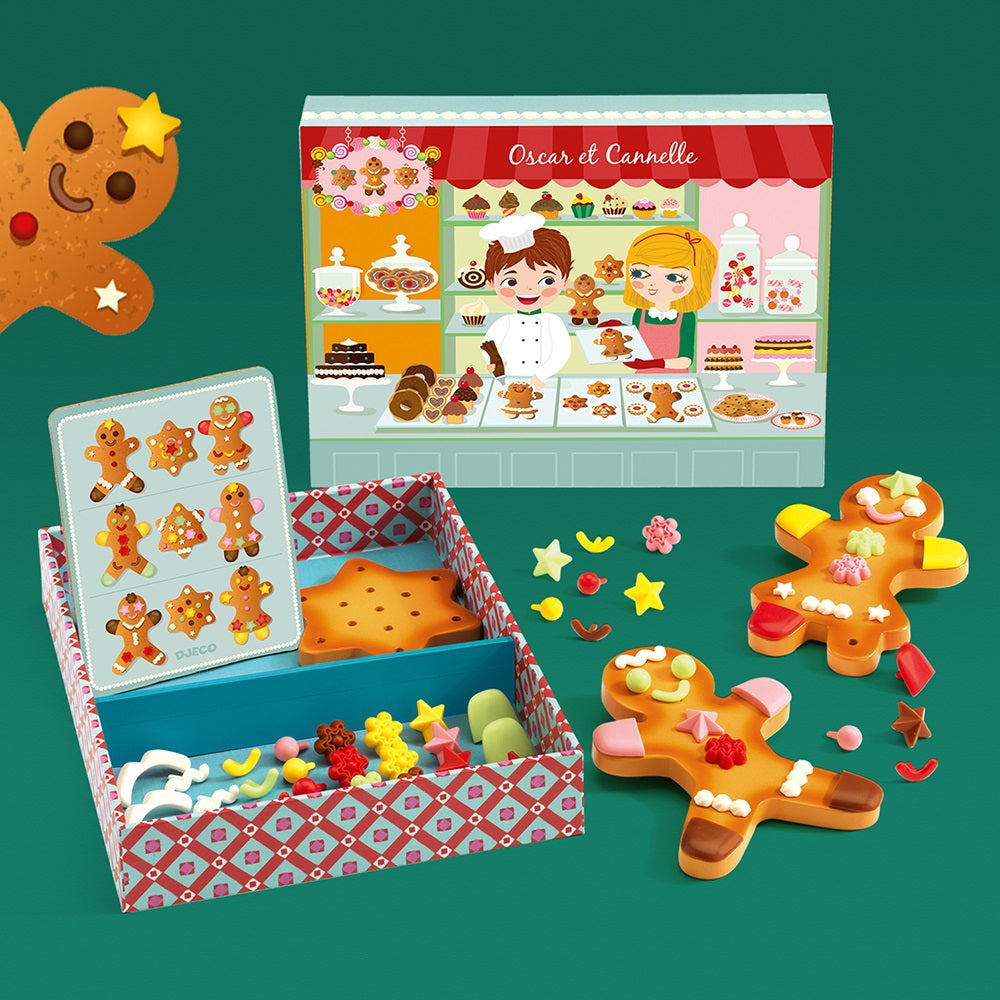 Oscar and Canelle's Gingerbread Shop is a lovely play food set for little ones to decorate their own gingerbread man, lady or star. The solid wood storage box is decorated as a sweet shop counter, open it up and arrange the various choices available to decorate a gingerbread.
