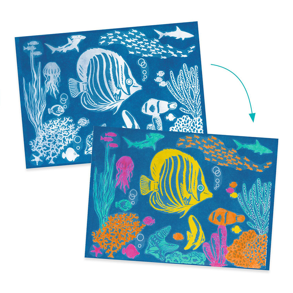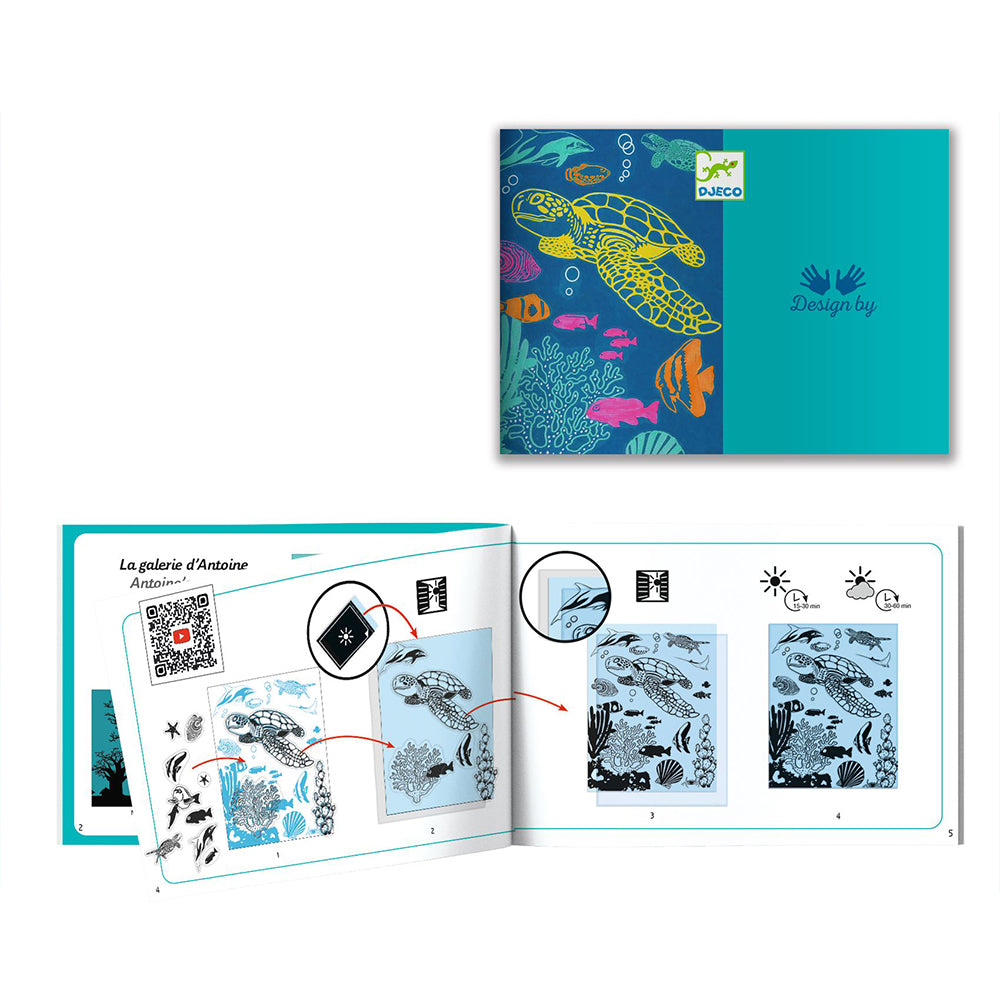 A creative kit by Djeco, inspired by the cyanotype photographic process, turning sunlight into magical works of art. Children place opaque patterns onto photosensitive paper and, once exposed to the sun, the negatives appear on a beautiful blue background. After rinsing the paper in clean water, the creations come to life before their eyes! With four felt-tip pens included, the pictures can be transformed into colourful underwater scenes. A magical, chemical-free activity that can be repeated over and over thanks to cyanotype paper refills, stimulating both imagination and creativity. Contents: 8 sheets of photosensitive paper (21 ? 28 cm), around 100 pre-printed plastic patterns, 1 sheet of plexiglass and 4 coloured felt-tip pens.