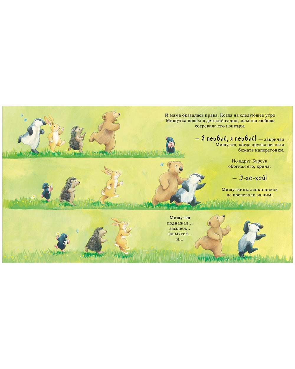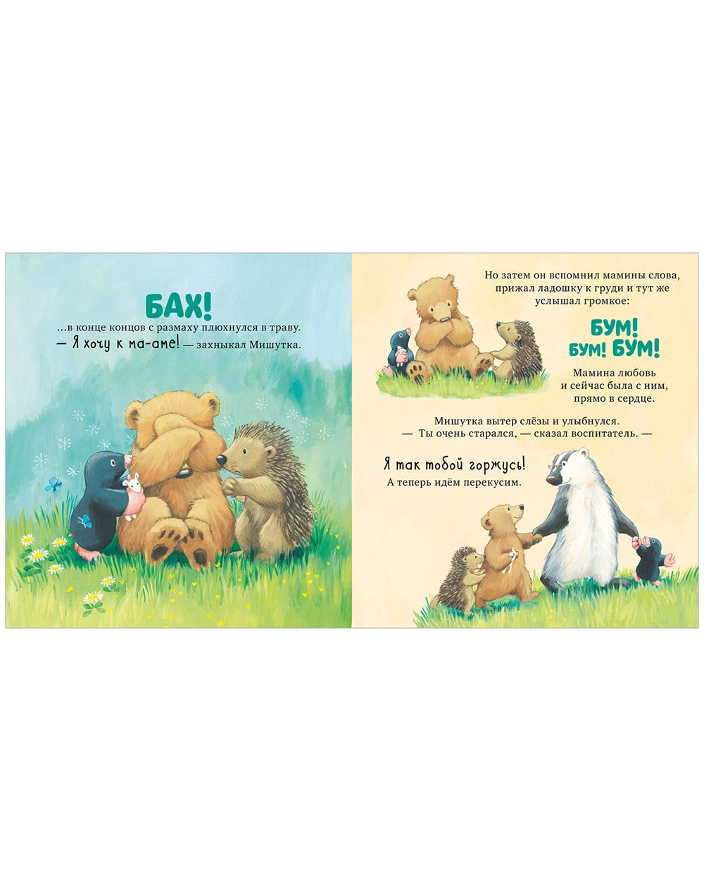 Трогательная сказка о безусловной любви между мамой и малышом. Маленький Мишутка беспокоится, что мама его разлюбит после того, как он сломал её любимый цветок. Но мама учит его, что её любовь вечна и всегда рядом. Книга в мягкой обложке идеальна для путешествий и прогулок — лёгкая, компактная и удобная для маленьких ручек. Нежные иллюстрации британской художницы Джейн Чапмен создают тёплую, уютную атмосферу. Особенно полезна для детей, готовящихся к детскому саду, помогая им понять, что расстояние не влияет на материнскую любовь.