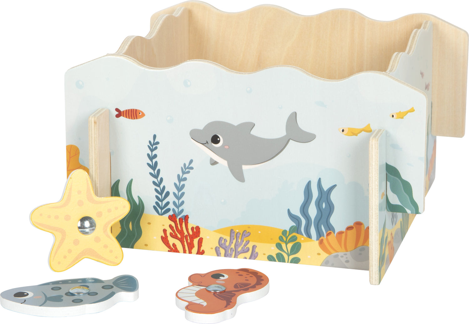 We're going fishing today! This especially kid-friendly fishing game is fun for the whole family and offers hours of gaming fun. The two robust magnetic wooden fishing poles allow small children's hands to fish for colourful sea creatures such as the seahorse, sea star, and fish to their hearts' content. The lovingly designed animals of this classic game of skill have numbers for practising counting and adding up players' fishing scores. The three-dimensional game field comprised of four connectable wooden side panels can be stored compactly, making the game great for when you're on-the-go. Young fishing pros can concentrate on improving their fishing skills and discovering the joy of play while simultaneously training their motor skills and dexterity. This is a wooden toy that's loads of fun combined with educational added value.