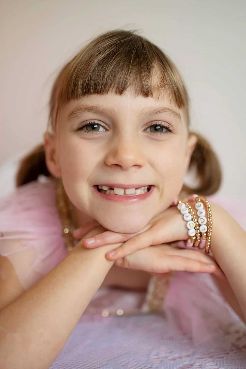 This delightful set features four beautifully designed bracelets in soft pink tones, perfect for young fashion enthusiasts who love expressing their style. Ideal for everyday wear or special occasions, these bracelets make wonderful gifts for children who appreciate playful, quality accessories. Mix and match the pieces to create your own unique look.