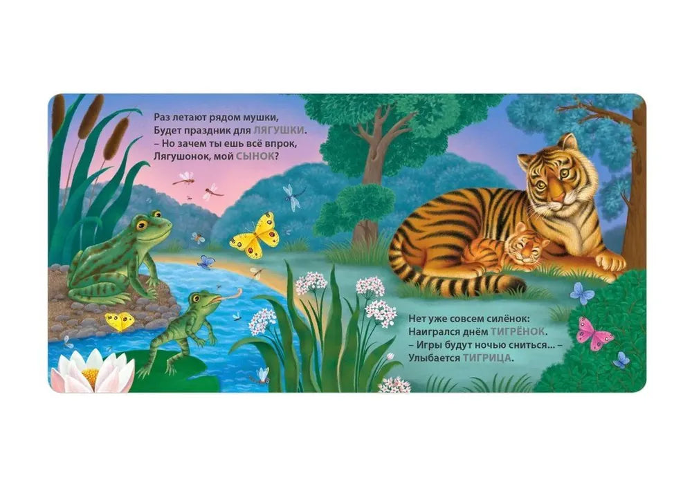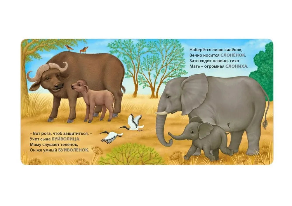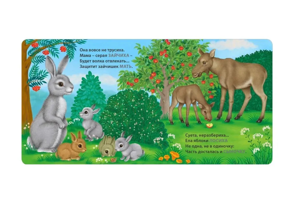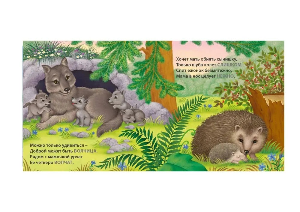 Книжки-картонки. Загадки-рифмы. Мамы и малыши. Дикие животные – рифмованные загадки про пары «мама–детёныш» в мире дикой природы: читаешь вопрос, ребёнок угадывает, потом рассматривает картинку и закрепляет названия.