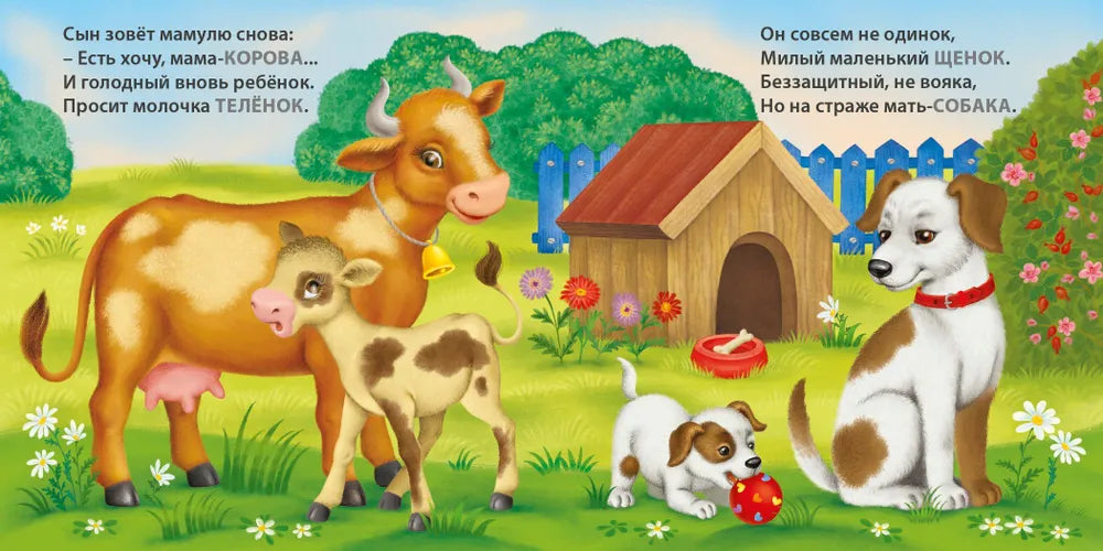 Книжки-картонки. Загадки-рифмы. Мамы и малыши. Домашние животные – рифмованные загадки про домашних животных и их малышей: взрослый читает загадку, ребёнок угадывает, а затем рассматривает иллюстрацию и запоминает названия.