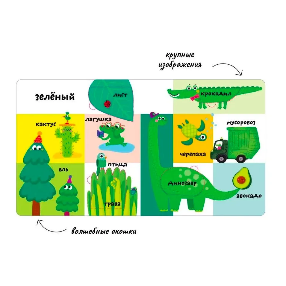 Благодаря ярким иллюстрациям, тактильным вставкам и большим окошкам ребёнок с лёгкостью пополнит свой словарный запас, изучит много нового и познавательного.