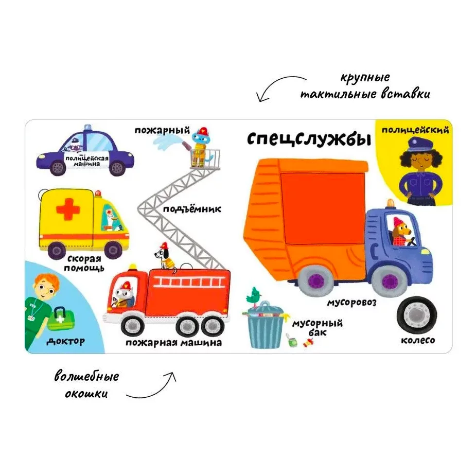 Необычная книжка для любознательных детей. Она познакомит вашего малыша со многими видами техники и транспорта: на дороге, на воде, в городе, в воздухе, на стройке и т. д. Он узнает более 100 слов. Благодаря ярким иллюстрациям, тактильным вставкам и большим окошкам ребёнок с лёгкостью пополнит свой словарный запас, изучит много нового и познавательного. Надо всего лишь открыть или потрогать! Топ-3 главных преимуществ: 3. 100 новых первых слов, которые малыш должен узнать до 3 лет 2. Самые популярные первые темы для малыша 1. Теперь любимые книжки с окошками еще и с тактильными вставками Что найдем внутри: – Более 100 слов на тему видов техники и транспорта: на дороге, на воде, в городе, в воздухе, на стройке и т. д. – Яркие иллюстрации, тактильные вставки и большие окошки. Важно знать родителям: Страницы книги сделаны из плотного картона высокого качества – створки можно открывать множество раз, книга прослужит долго. Рекомендована для детей от 1 года.