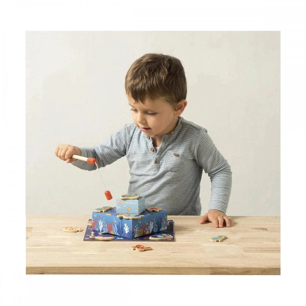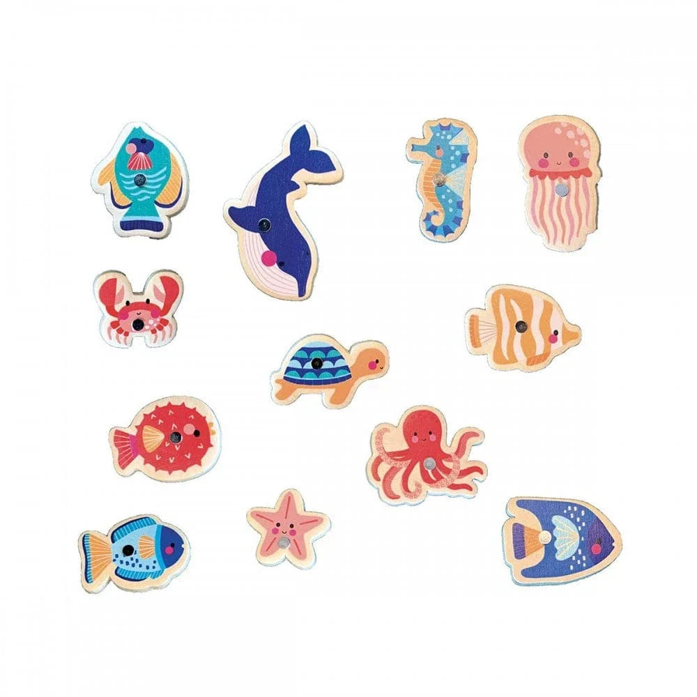 Dive into fun with this Auzou fishing game designed for ages 2+. Use the special fishing rods to catch 12 colorful sea creatures. A delightful activity that encourages hand-eye coordination and imaginative ocean play in a compact, portable format.