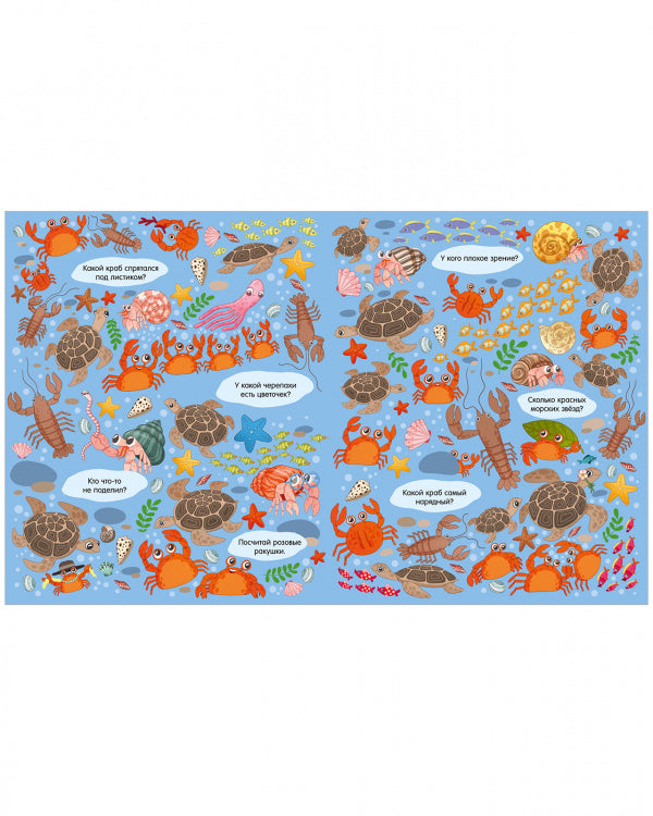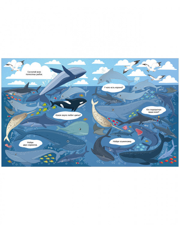 Формат игры «Найди и покажи» надолго увлечет ребенка, он будет возвращаться к этой книге снова и снова. Только самые зоркие смогут найти всех божьих коровок среди стаи птиц, сосчитать всех пчел в лесу и всех змей, спрятавшихся среди лиан. Рассматривайте иллюстрации, выполняйте задания книги «Найди и покажи океаны и моря» и изучайте невероятный мир животных.