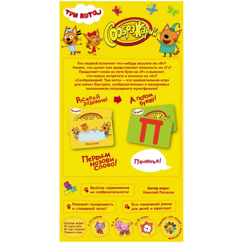 Кто первый вспомнит что-нибудь вкусное на "И"? Узнает, что шумит или представляет опасность на "Г"? Придумает слово из пяти букв на "Р" и выяснит, что можно встретить в космосе на "А"? "Соображарий: Три кота" — это увлекательная игра для самых быстрых, сообразительных и находчивых поклонников популярного мультфильма!