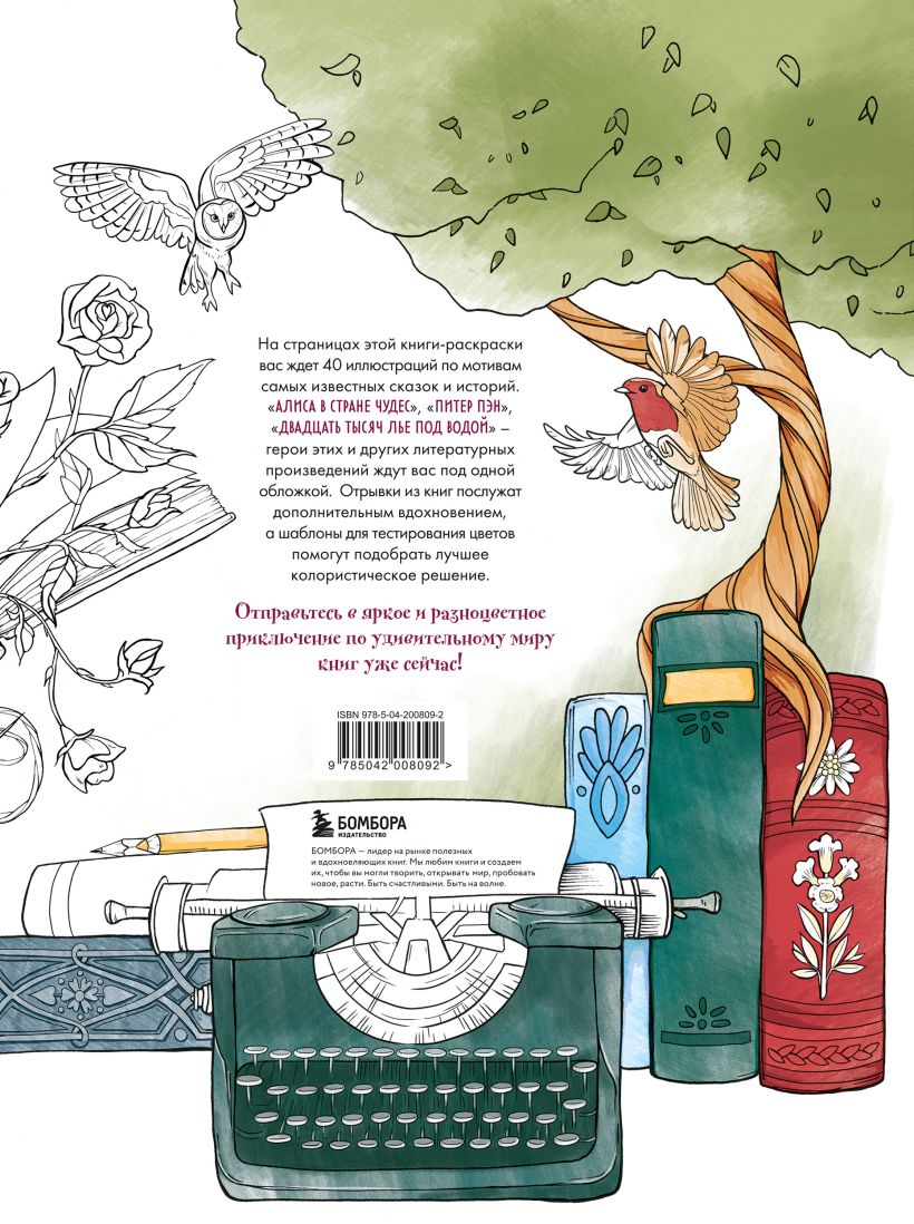 Внутри вас ожидает более 40 фантастических сюжетов по мотивам уже известных миру историй и рассказов — от «Алисы в Стране чудес» до «Ромео и Джульетты». Каждая иллюстрация сопровождается захватывающими цитатами, чтобы больше погрузить вас в процесс раскрашивания и сделать ваш вечер еще более увлекательным и познавательным.