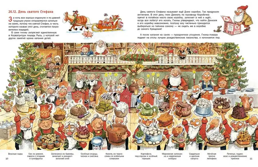 Присоединяйтесь к Санте и его верным гномам в волшебной деревне Корватунтури! Эта чудесная история рассказывает о том, как обитатели Северного полюса отмечают двенадцать дней Рождественских каникул. Танцы, игры, представления и обмен подарками — каждый день приносит новые приключения! От Дня спорта до Дня театра, от лыжных прогулок до забавного валяния в снегу — в этой книге каждый найдет что-то по душе. Иллюстрации Маури Куннаса оживляют праздничную атмосферу и дарят читателям настоящее рождественское волшебство. Идеальный выбор для семейного чтения в праздничный сезон!