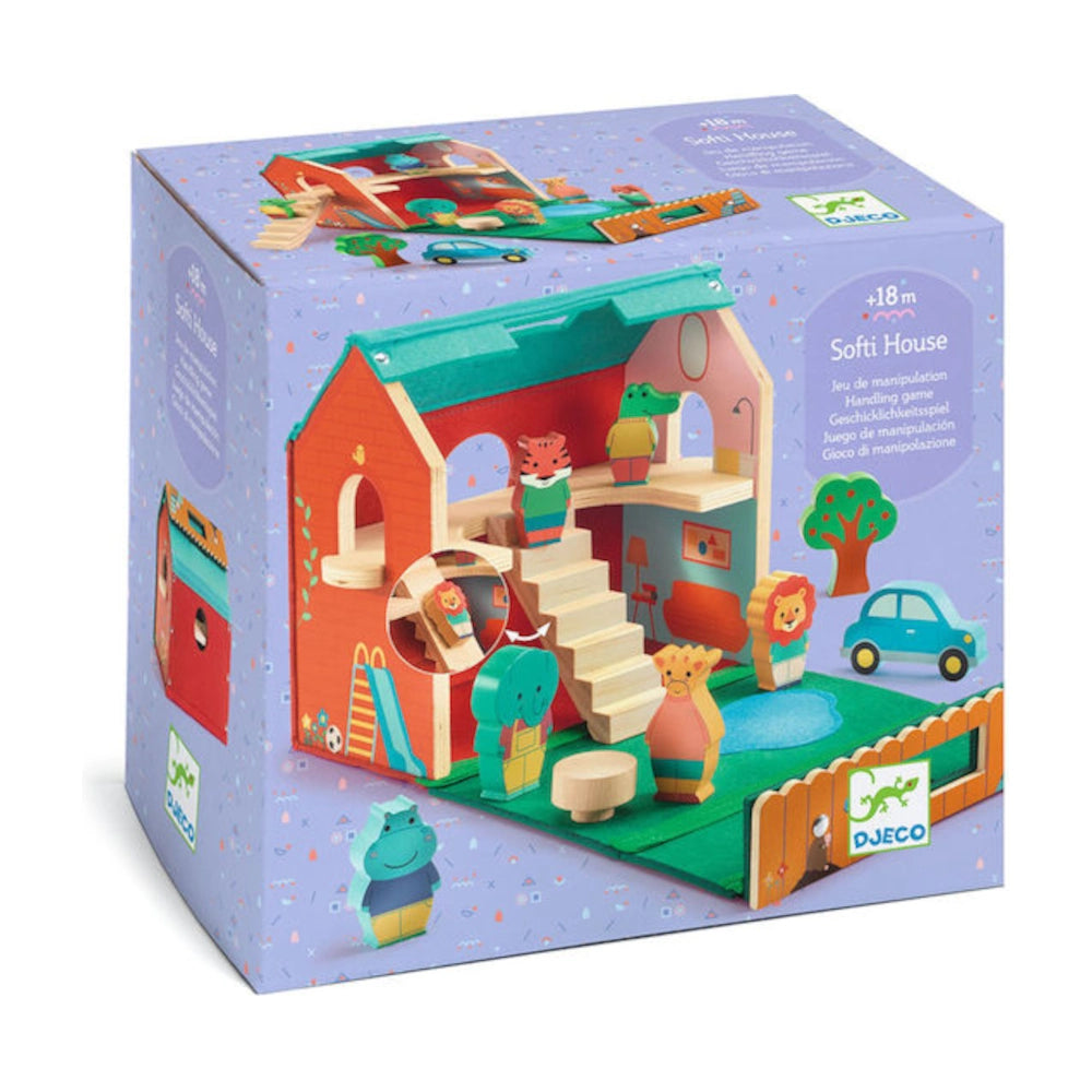 SoftiHouse by Djeco is a portable felt and wooden playhouse designed for toddlers from 18 months. Open it to reveal 7 wooden figures, a car, convertible slide-staircase, and garden space. Encourages imaginative storytelling and creative play. Compact handle makes it easy to carry anywhere. Store all pieces inside when playtime ends.