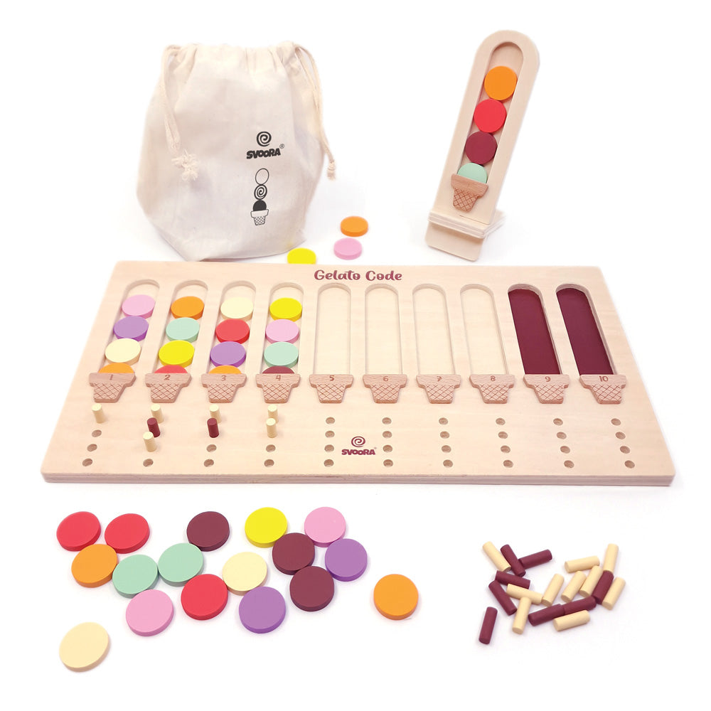Discover Svoora's sweetest board game and enter an exciting showdown of flavors and logic! One player chooses a secret delicious ice cream recipe, while their opponent must guess it. Each incorrect prediction reveals a valuable clue, but time is running out! The goal? Find the right combination with the fewest attempts and become the ultimate "gelato master"! A game of observation, strategy & intuition, ideal for ice cream lovers and those who enjoy a good challenge! Suitable for ages 6 and up. Includes two levels of difficulty.