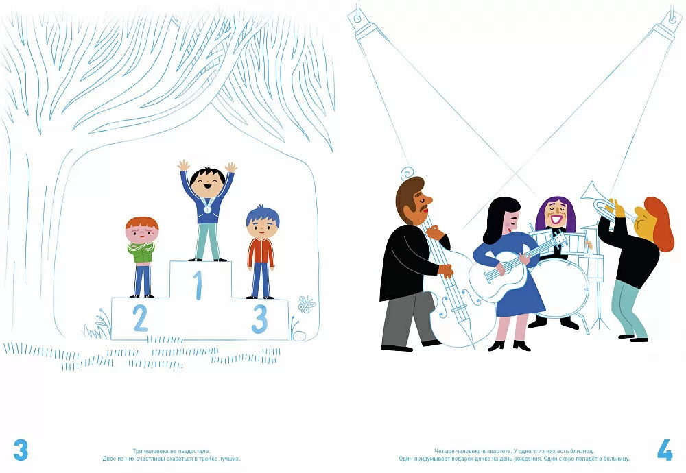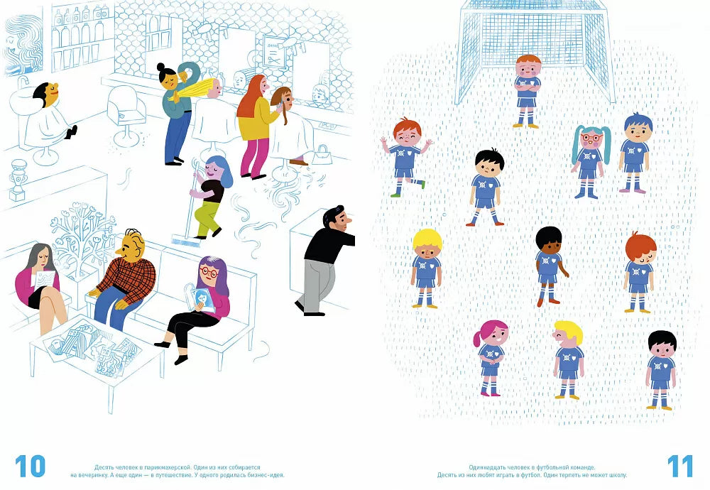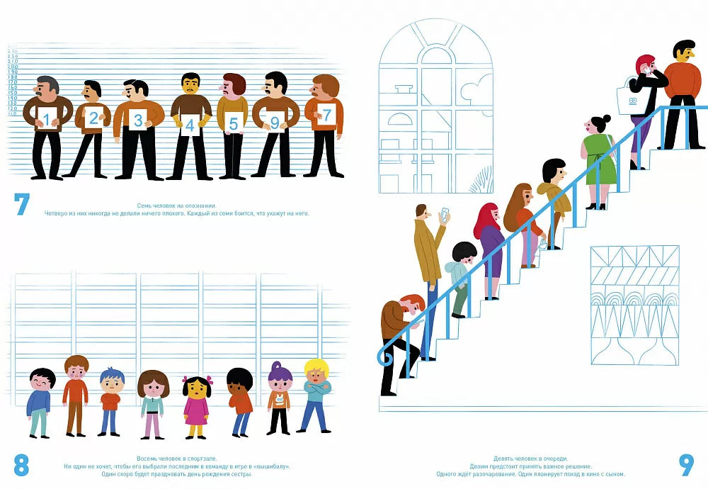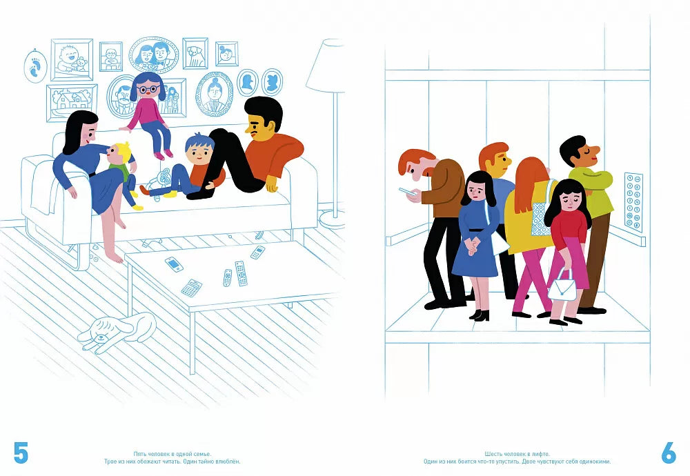 «Все считаются» — это и активити, и искалка, и книга на счет, и одновременно книжка-картинка о человечестве, и о роли каждого в огромном мире. Эта смешная книга научит считать от 0 до 7,5 миллиардов, а еще наблюдать за людьми, переживать с ними вместе разные эмоции и видеть, как переплетаются их истории. Ни один герой не появляется в книжке просто так, каждый — часть чего-то большего: семьи, блошиного рынка или толпы в аэропорту. И все связаны между собой! Легко убедиться, что все в мире очень разные, у всех своя жизнь, и, что еще важнее — что все считаются!
